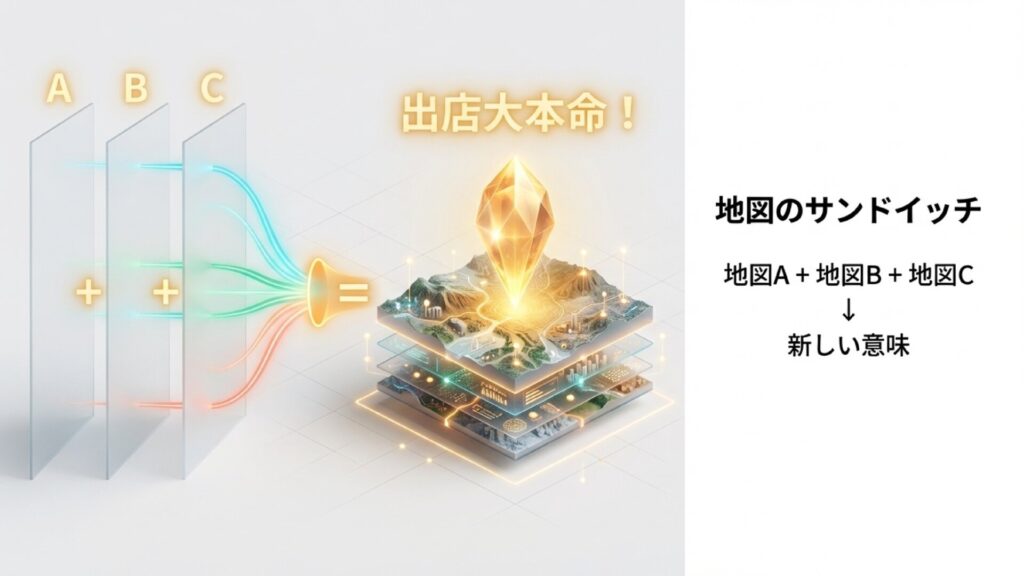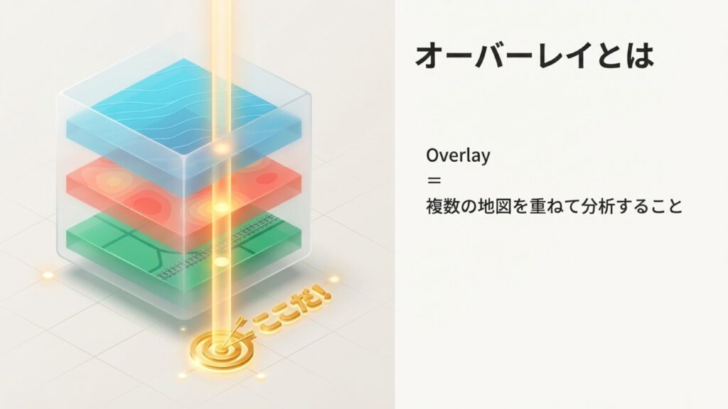 複数の地理データを重ね合わせて、新しい情報を生み出すGISの分析手法です。