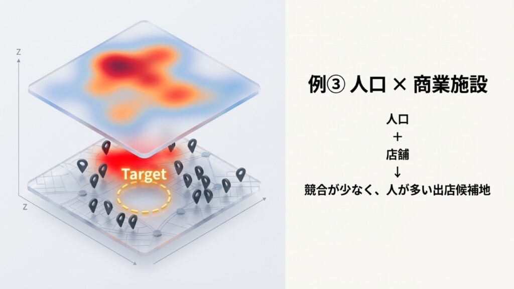 ビジネスにおいて、新しい店舗を出店する場所を探す際によく使われる分析です。