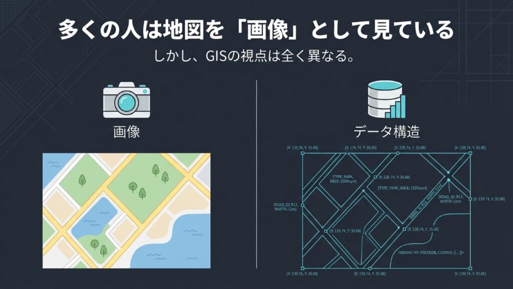 しかし、地理情報システム(GIS)で扱う地図は、単なる絵ではありません。