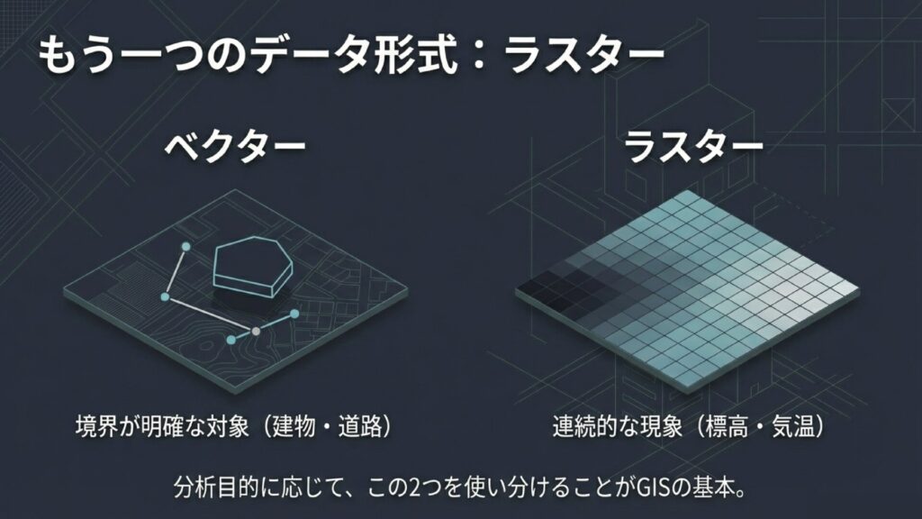 GISで扱う空間データには、もう一つ重要な形式があります。