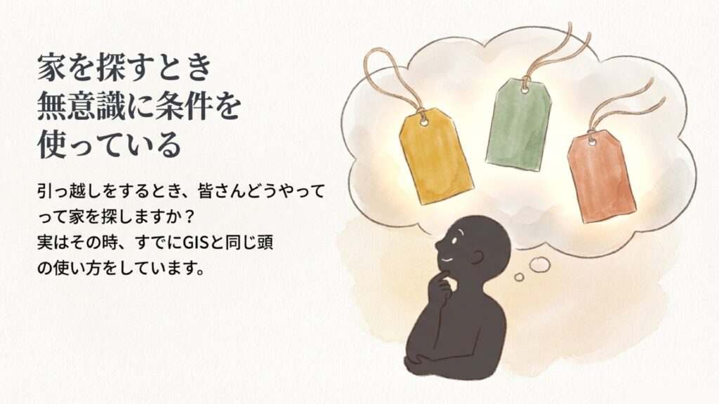 GISが条件で絞るツールだと分かると、最も重要なスキルが見えてきます。