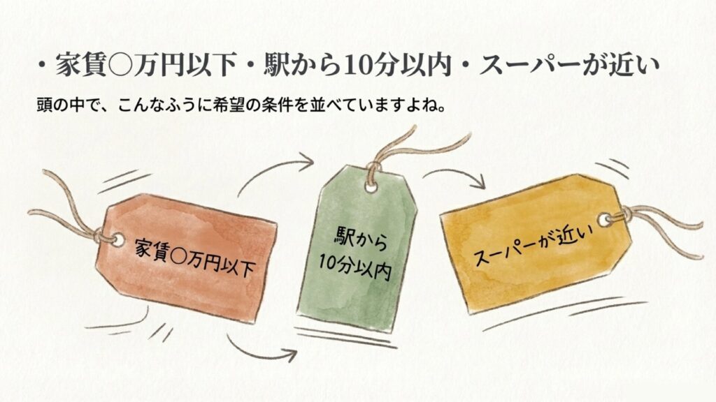 「家賃は〇〇万円以下で、駅から徒歩10分以内。近くにスーパーがある場所がいいな」