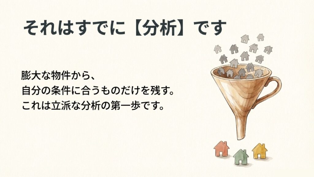 私たちは日常生活の中で、無意識のうちにいくつかの条件を設定し、膨大な選択肢の中から最適なものを絞り込んでいます。実は、この「条件で絞る」という行為こそが、すでに立派な「分析」なのです。