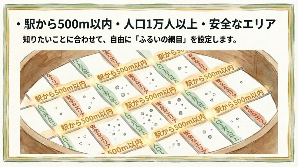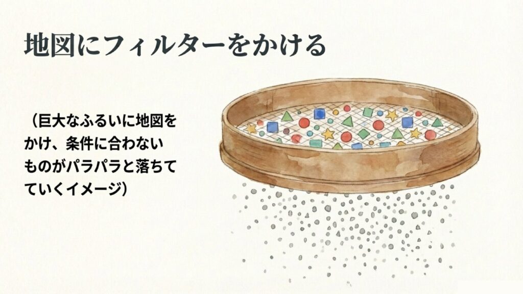 イメージとしては、地図の上にふるい(フィルター)をかけて、