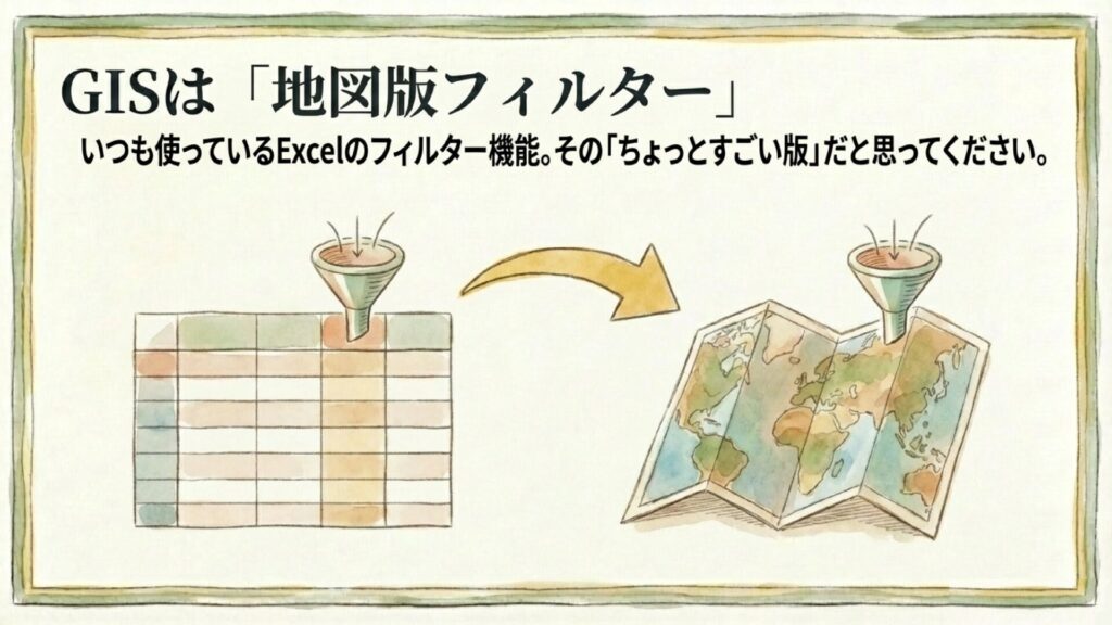 GISは「空間(場所や距離)」も扱える、フィルター機能の拡張版です。