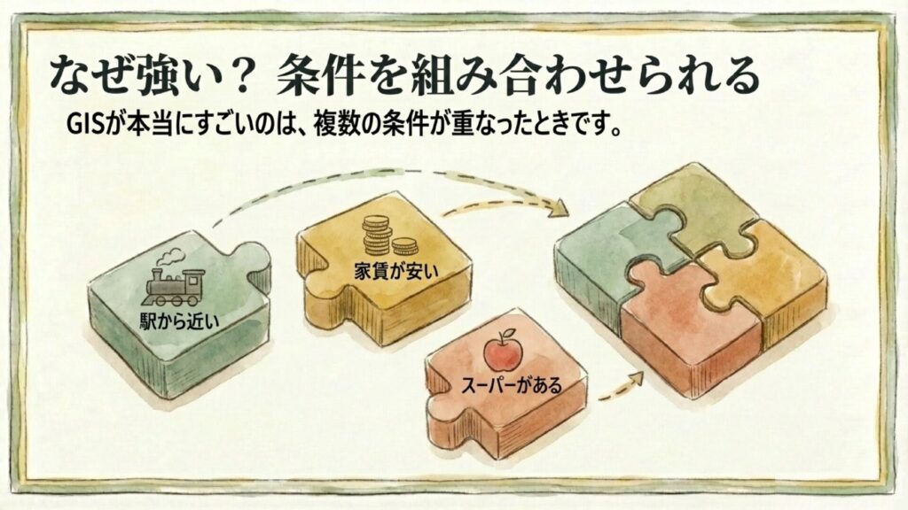 GISが本当に力を発揮するのは、条件が1つではなく「複数」組み合わさったときです。