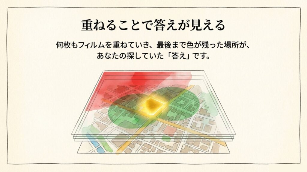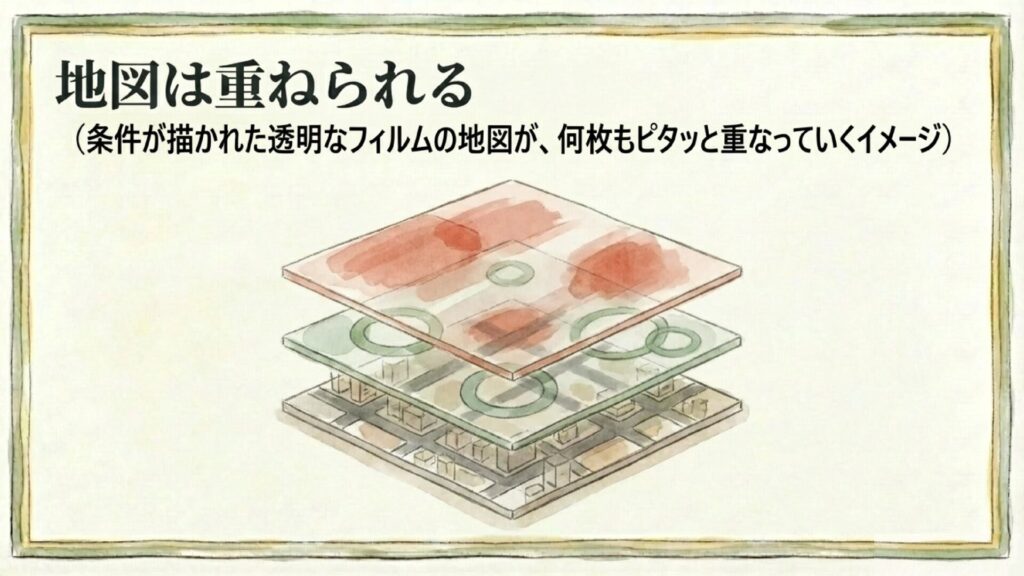「地図を重ねて、共通部分を取り出す」ことです。
