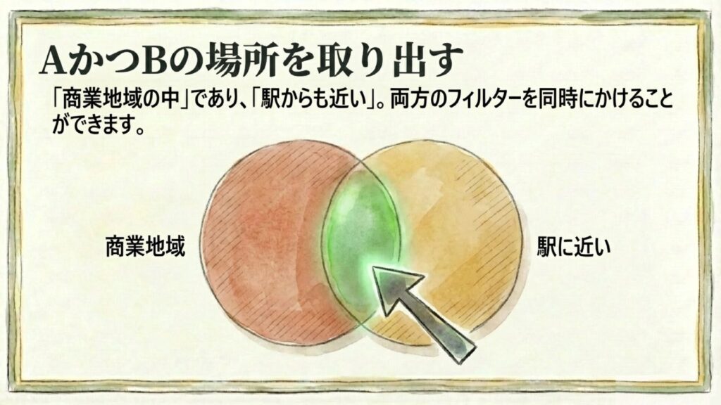 「AかつB(AND条件)」を満たす場所だけを取り出すことができます。