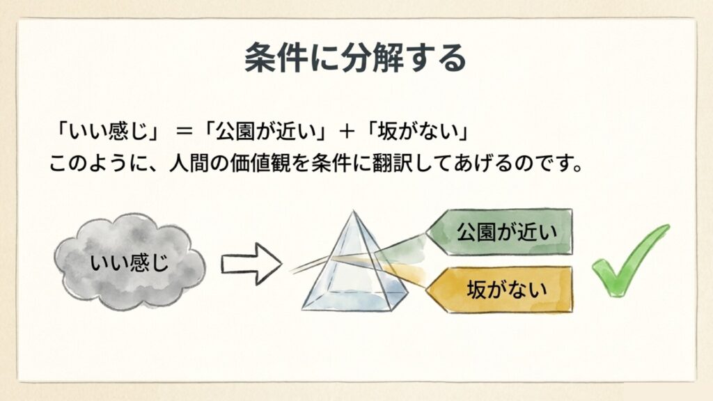 - ✅ 良い例:スーパーから500m以内で、坂が少なく、公園が多い場所
